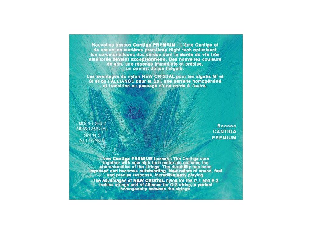 Sada strun Cantiga Creation Premium kombinuje výhodu stávajících strun Savarez z nylonu (e1, h - New Cristal), kompozitu (g - Alliance) a nových technologií a surovin (d, A, E - New Cantiga Premium), které dávají basovým strunám hlubší a mohutnější zvuk, jemně obohacený o vyšší alikvotní tóny pro rozsáhlé možnosti zvukových barev i drobných nuancí.