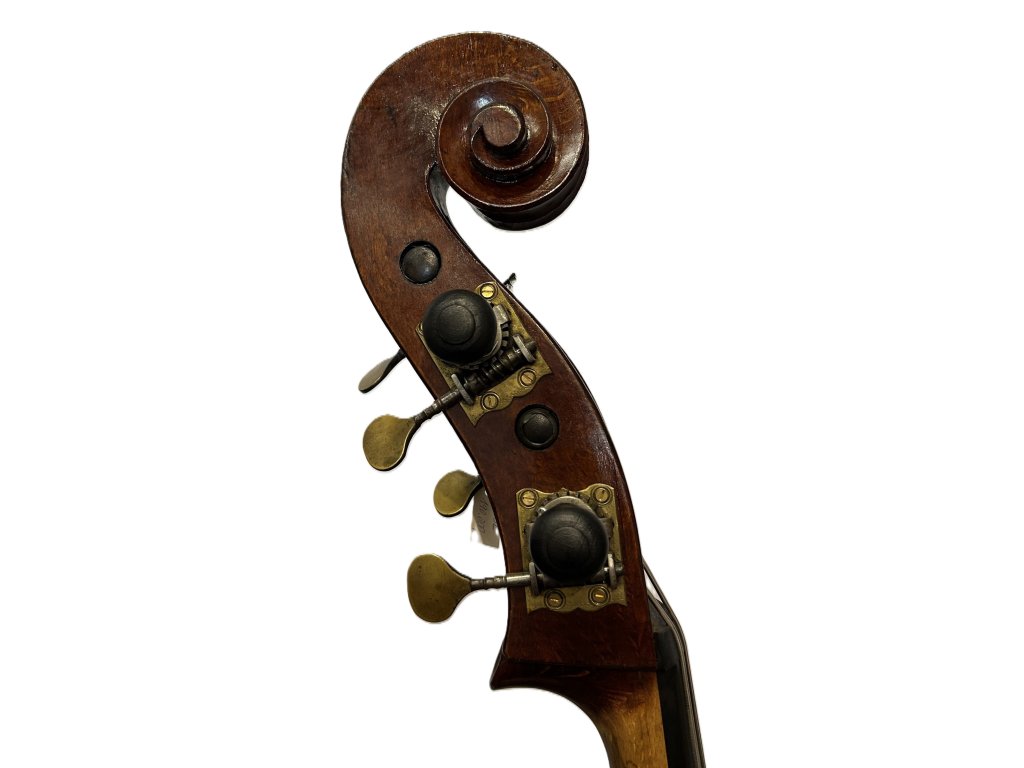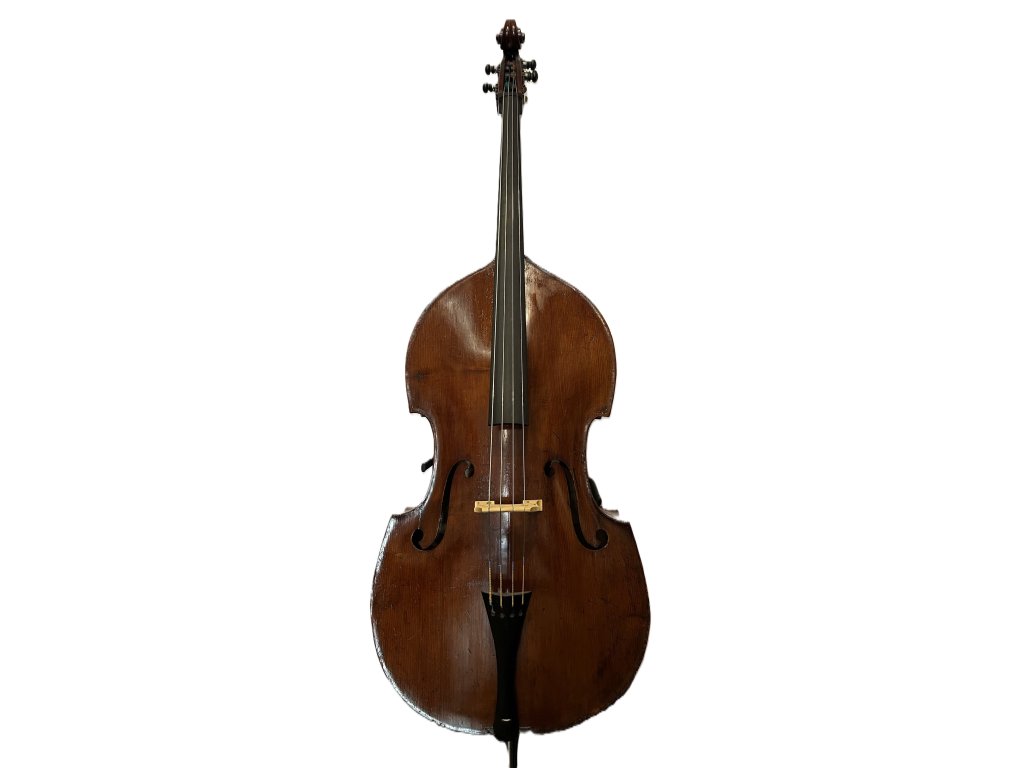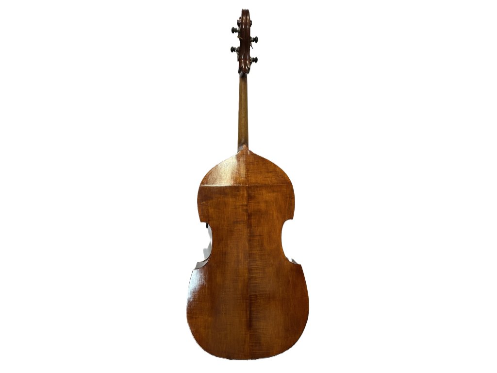 Manufakturní celomasivní kontrabas s plochou zadní deskou, po nedávné generální opravě.